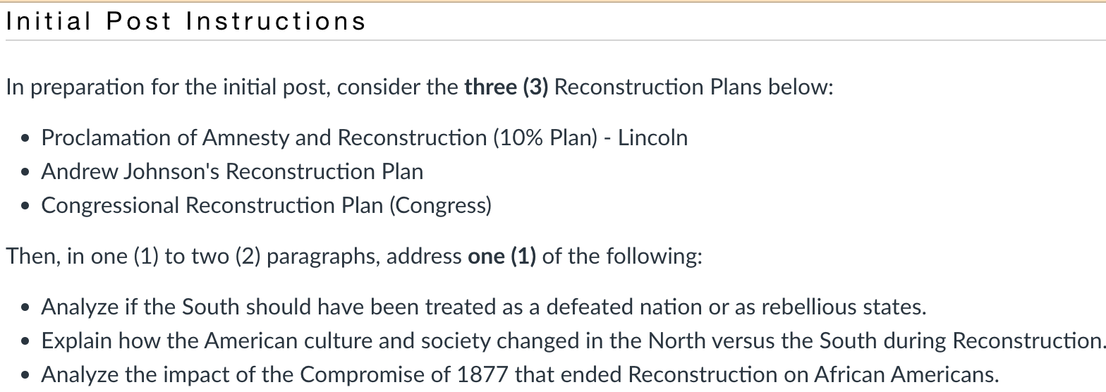 In preparation for the initial post, consider the three (3) Reconstruction Plans below: