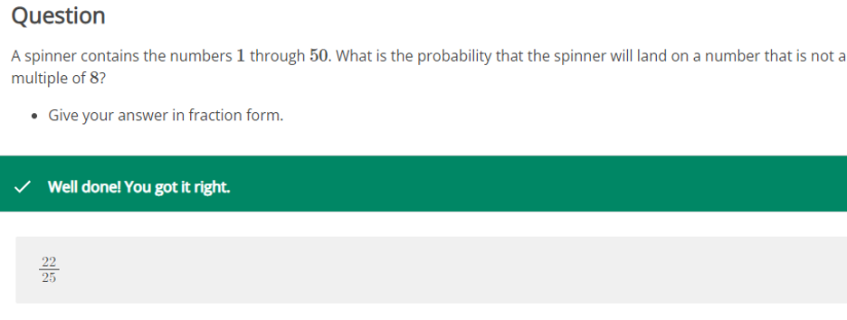 - A spinner contains the numbers 1through 50. What is the probability that the spinner will land on a number that is not a multiple of 8? Give your answer in fraction form. 22/25
