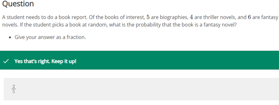 - While commuting, a driver sets her smartphone to randomly play songs from a pre-selected list. Of the songs on the list, 6are rock, 5are hip-hop, and 3 are country. What is the probability that the first song played is rock? Give your answer as a fraction. 3/7