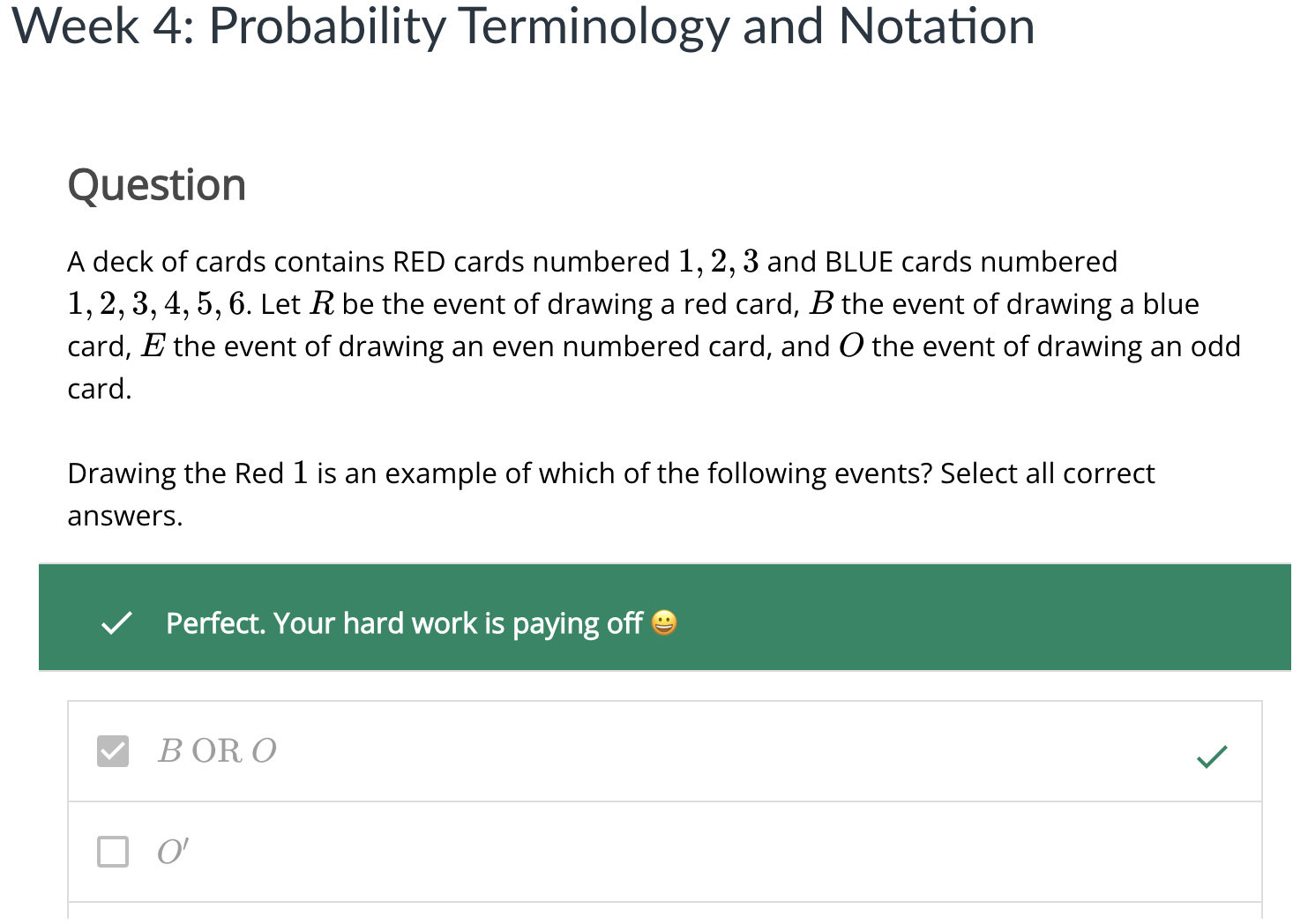 - A deck of cards contains RED cards numbered 1,2,3,4 and BLUE cards numbered 1,2,3,4,5. Let R be the event of drawing a red card, B the event of drawing a blue card, E the event of drawing an even numbered card, and O the event of drawing an odd card.