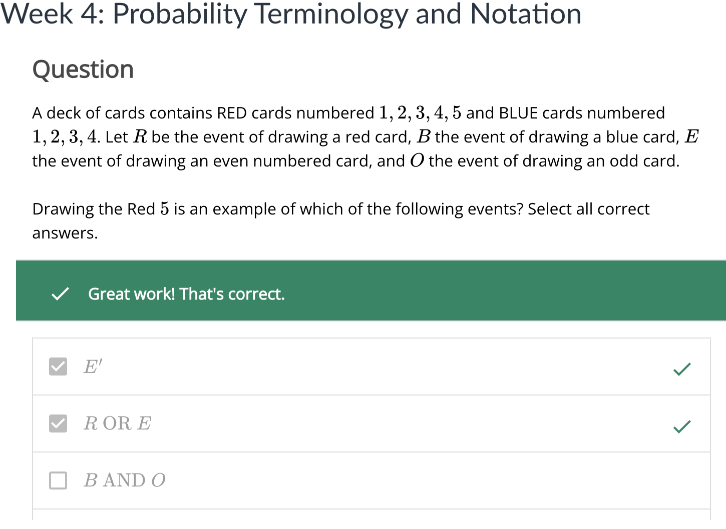 - A deck of cards contains RED cards numbered 1,2,3,4,5 and BLUE cards numbered 1,2,3,4. Let R be the event of drawing a red card, B the event of drawing a blue card, E the event of drawing an even numbered card, and O the event of drawing an odd card.