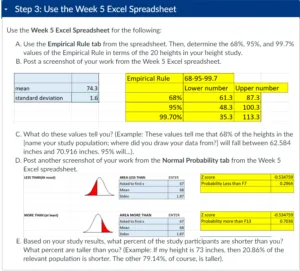 1b. Post a screen shot in the space BELOW of the portion of the Week 3 spreadsheet that helped you determine these values. Please list the 10 heights your professor provided first followed by the 10 heights you collected. There should be 20 values to determine the mean and sample standard deviation.