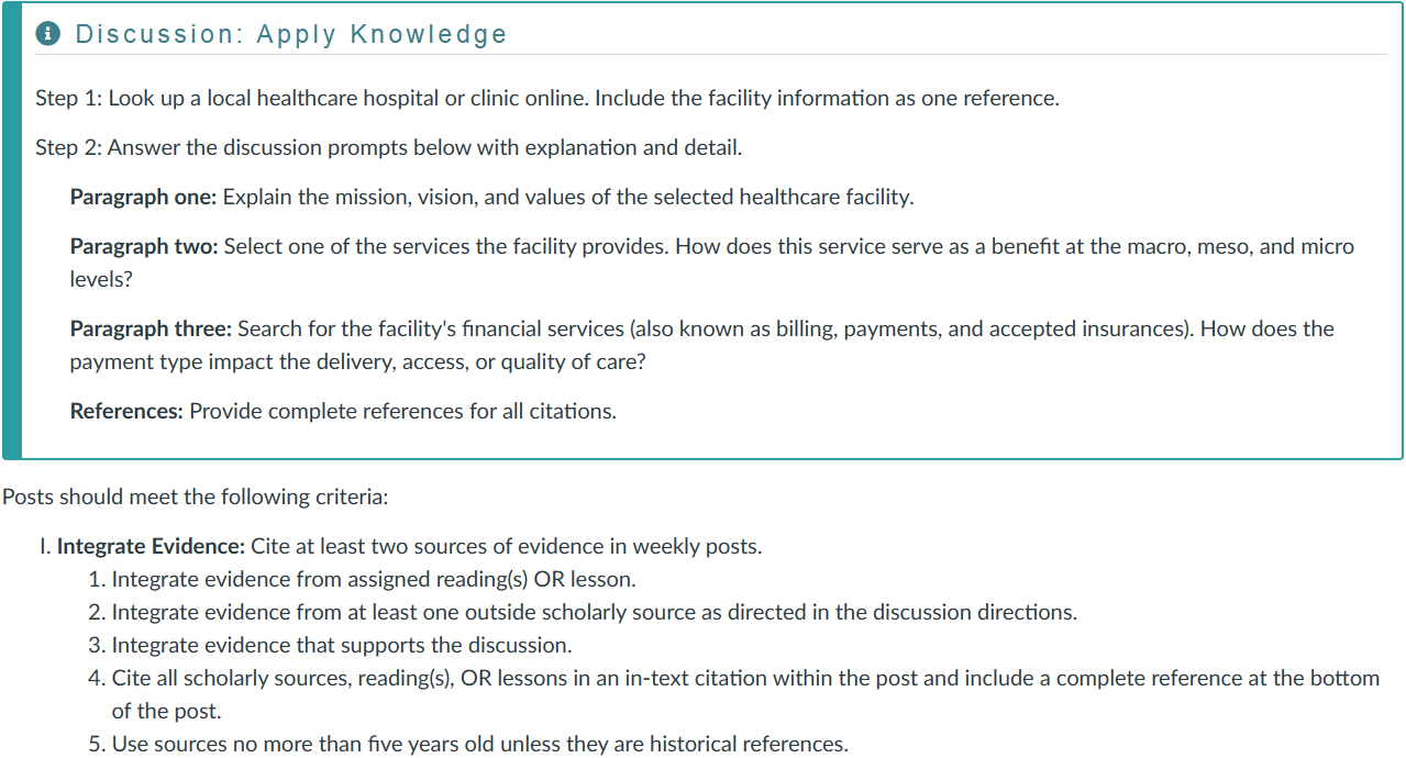 - Integrate Evidence: Cite at least two sources of evidence in weekly posts.