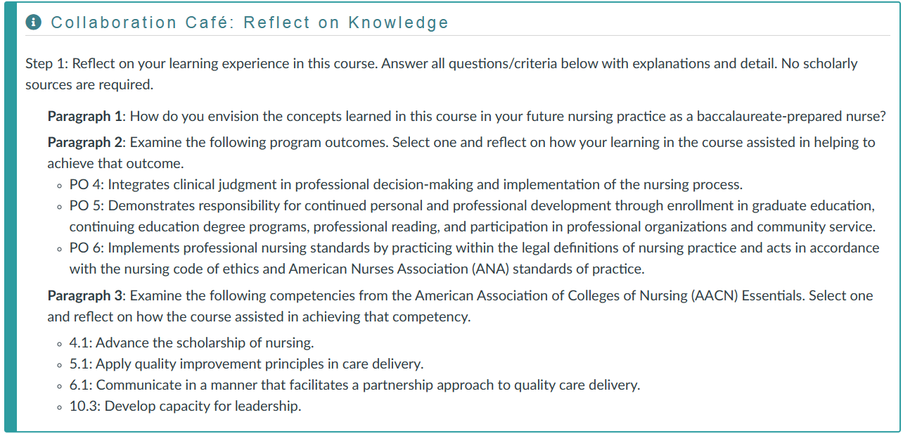 - Paragraph 3: Examine the following competencies from the American Association of Colleges of Nursing (AACN) Essentials. Select one and reflect on how the course assisted in achieving that competency.
