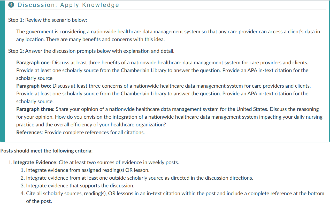 - Paragraph two: Discuss at least three concerns of a nationwide healthcare data management system for care providers and clients. Provide at least one scholarly source from the Chamberlain Library to answer the question. Provide an APA in-text citation for the scholarly source.