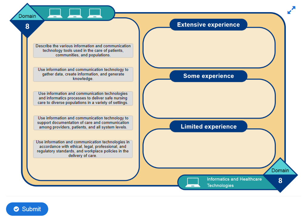 Paragraph three: Consider your experience level with each of the American Association of College of Nursing (AACN) informatics competencies upon course completion. Drag and drop each competency to the box corresponding to your knowledge, skill, and experience level. Reflect on how your learning in the course assisted in achieving one Domain 8 competency.