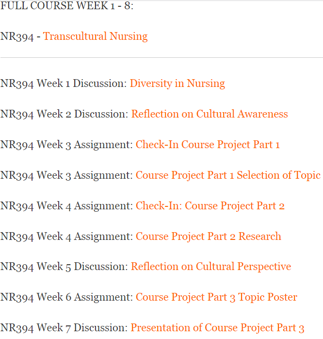 NR394 Week 8 Discussion: Reflection on Transcultural Nursing…………………………..purchase the entire class at $40 and save $15