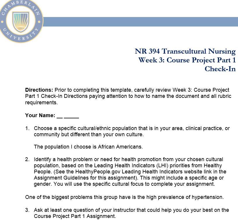 NR394 Week 3 Assignment: Check-In Course Project Part 1