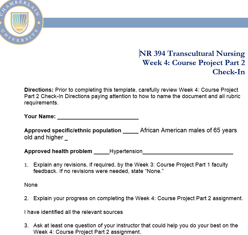NR394 Week 4 Assignment: Check-In: Course Project Part 2
