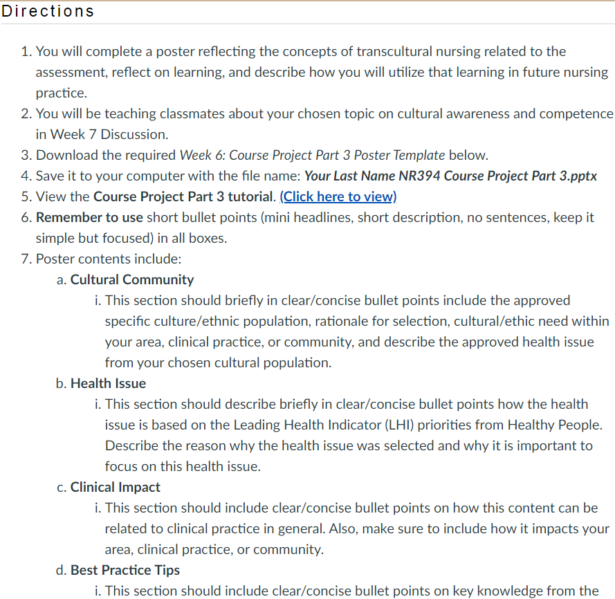 - You will complete a poster reflecting the concepts of transcultural nursing related to the assessment, reflect on learning, and describe how you will utilize that learning in future nursing practice.