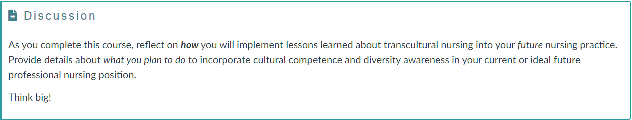 As you complete this course, reflect on how you will implement lessons learned about transcultural nursing into your future nursing practice. Provide details about what you plan to do to incorporate cultural competence and diversity awareness in your current or ideal future professional nursing position.