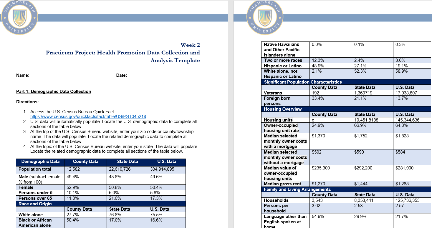- Use the data collected from the Practicum Project: Sources of Data document and other professional sources to complete the Practicum Project: Health Promotion Data Collection and Analysis template.
