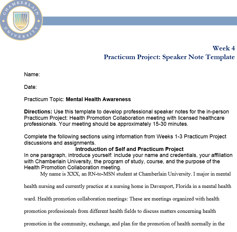 - Use information from Weeks 1 – 3 Practicum Project discussions and assignment to complete the Week 4 Practicum Project: Speaker Note Template.