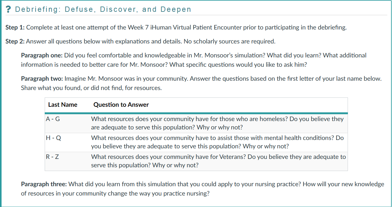 NR436 Week 7 Discussion: iHuman Virtual Patient Encounter Debriefing