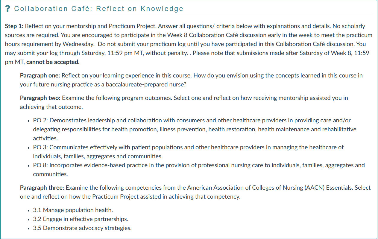 Step 1: Reflect on your mentorship and Practicum Project. Answer all questions/ criteria below with explanations and details. No scholarly sources are required. You are encouraged to participate in the Week 8 Collaboration Café discussion early in the week to meet the practicum hours requirement by Wednesday. Do not submit your practicum log until you have participated in this Collaboration Café discussion. You may submit your log through Saturday, 11:59 pm MT, without penalty. . Please note that submissions made after Saturday of Week 8, 11:59 pm MT, cannot be accepted.