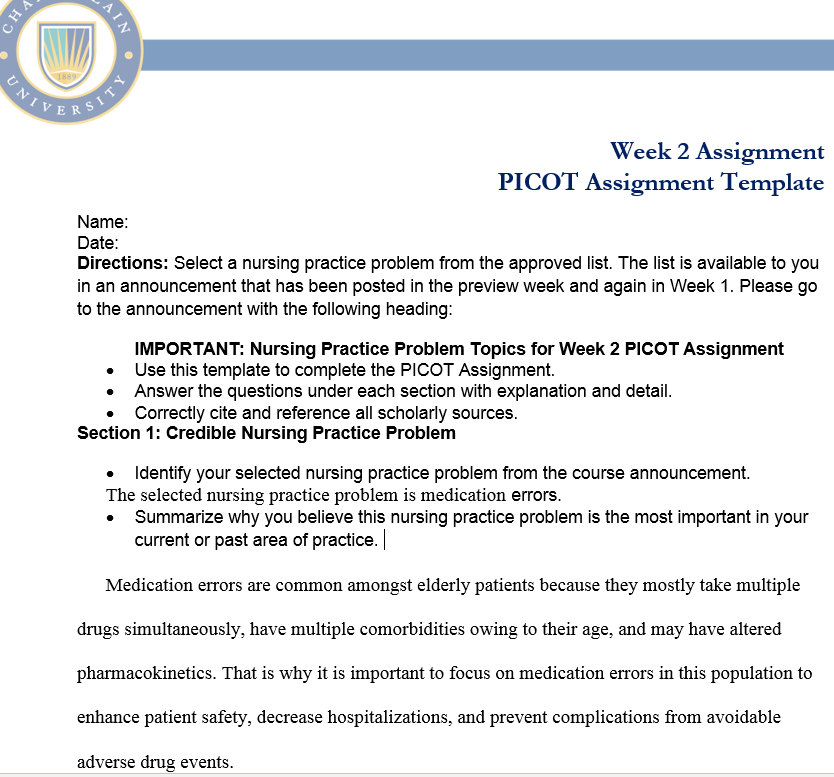 2. Select a nursing practice problem from the approved list. The list is available in an announcement posted in preview week and in Week 1. The announcement is titled: IMPORTANT: Nursing Practice Problem Topics for Week 2 PICOT Assignment