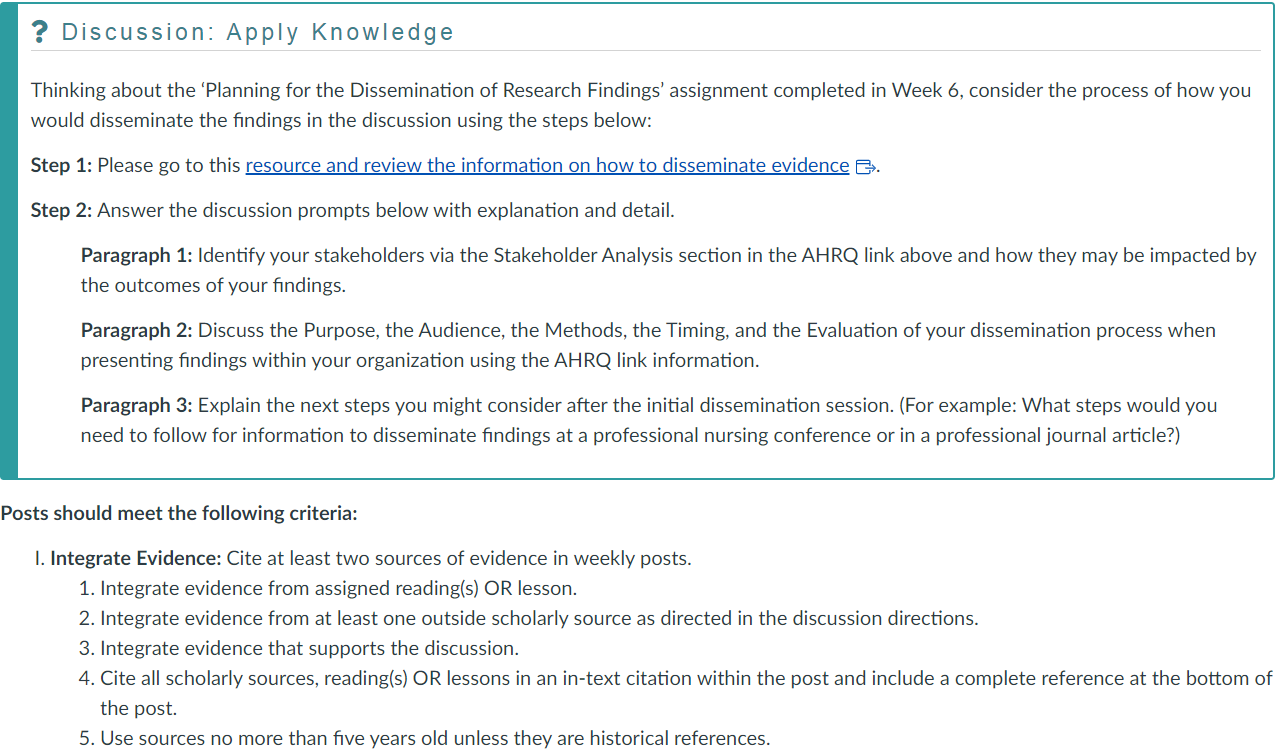 - Integrate Evidence: Cite at least two sources of evidence in weekly posts.