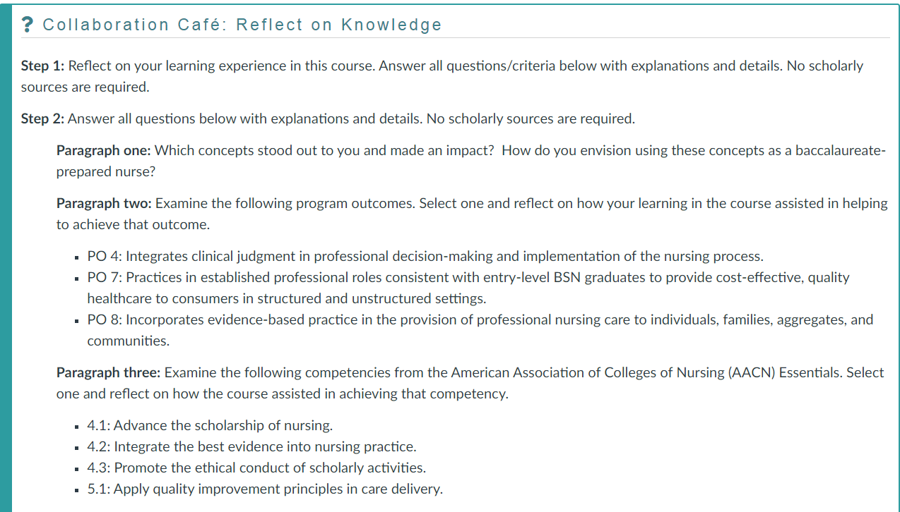 Paragraph three: Examine the following competencies from the American Association of Colleges of Nursing (AACN) Essentials. Select one and reflect on how the course assisted in achieving that competency.