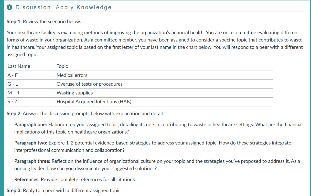 - Paragraph one: Elaborate on your assigned topic, detailing its role in contributing to waste in healthcare settings. What are the financial implications of this topic on healthcare organizations?Paragraph two: Explore 1-2 potential evidence-based strategies to address your assigned topic. How do these strategies integrate interprofessional communication and collaboration?Paragraph three: Reflect on the influence of organizational culture on your topic and the strategies you’ve proposed to address it. As a nursing leader, how can you disseminate your suggested solutions?References: Provide complete references for all citations.