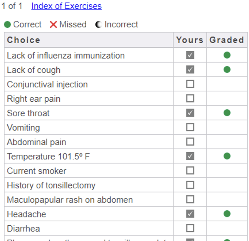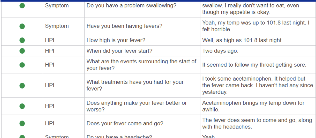 | HPI | How would you rate the severity of your sore throat? | Honestly, it’s extremely painful—like an ice pick in my throat. It’s the worst I’ve ever had. On a scale of 1 to 10, it’s an 11………………purchase all the simulation key questions, physical assessment activities, and EHR at $25 only