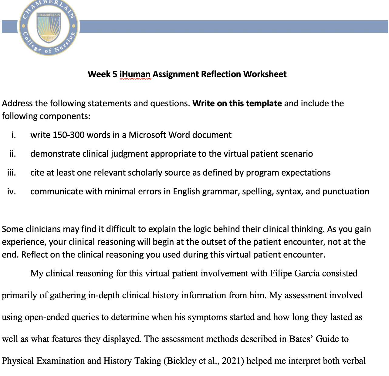 Reflection: Download this worksheet Address the following question: Some clinicians may find it difficult to explain the logic behind their clinical thinking. As you gain experience, your clinical reasoning will begin at the outset of the patient encounter, not at the end. Reflect on the clinical reasoning you used during this virtual patient encounter. Describe the steps taken to identify and interpret the key findings in this case. What are some “lessons learned” within the assessment that you can apply to your professional practice as a provider? Include the following components: