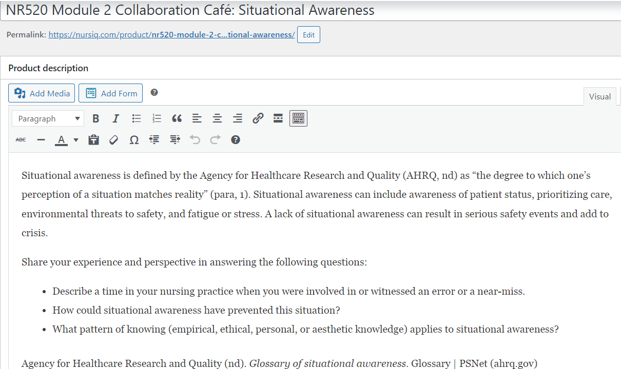 Situational awareness is defined by the Agency for Healthcare Research and Quality (AHRQ, nd) as “the degree to which one’s perception of a situation matches reality” (para, 1). Situational awareness can include awareness of patient status, prioritizing care, environmental threats to safety, and fatigue or stress. A lack of situational awareness can result in serious safety events and add to crisis.