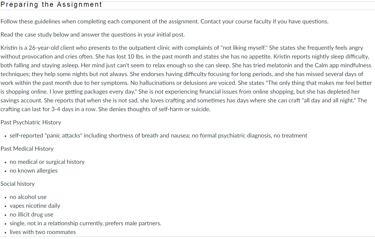 Kristin is a 26-year-old client who presents to the outpatient clinic with complaints of “not liking myself.” She states she frequently feels angry without provocation and cries often. She has lost 10 lbs. in the past month and states she has no appetite. Kristin reports nightly sleep difficulty, both falling and staying asleep. Her mind just can’t seem to relax enough so she can sleep. She has tried melatonin and the Calm app mindfulness techniques; they help some nights but not always. She endorses having difficulty focusing for long periods, and she has missed several days of work within the past month due to her symptoms. No hallucinations or delusions are voiced. She states “The only thing that makes me feel better is shopping online. I love getting packages every day.” She is not experiencing financial issues from online shopping, but she has depleted her savings account. She reports that when she is not sad, she loves crafting and sometimes has days where she can craft “all day and all night.” The crafting can last for 3-4 days in a row. She denies thoughts of self-harm or suicide.