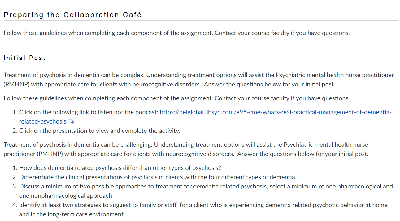 Treatment of psychosis in dementia can be complex. Understanding treatment options will assist the Psychiatric mental health nurse practitioner (PMHNP) with appropriate care for clients with neurocognitive disorders. Answer the questions below for your initial post