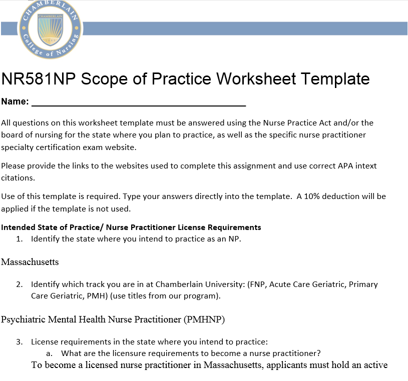 - Complete the NR581NP Scope of Practice Assignment template.