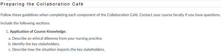 Follow these guidelines when completing each component of the Collaboration Café. Contact your course faculty if you have questions.