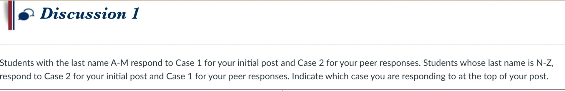 Students with the last name A-M respond to Case 1 for your initial post and Case 2 for your peer responses. Students whose last name is N-Z, respond to Case 2 for your initial post and Case 1 for your peer responses. Indicate which case you are responding to at the top of your post.