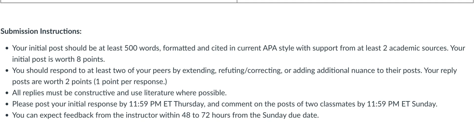 - Please post your initial response by 11:59 PM ET Thursday, and comment on the posts of two classmates by 11:59 PM ET Sunday.