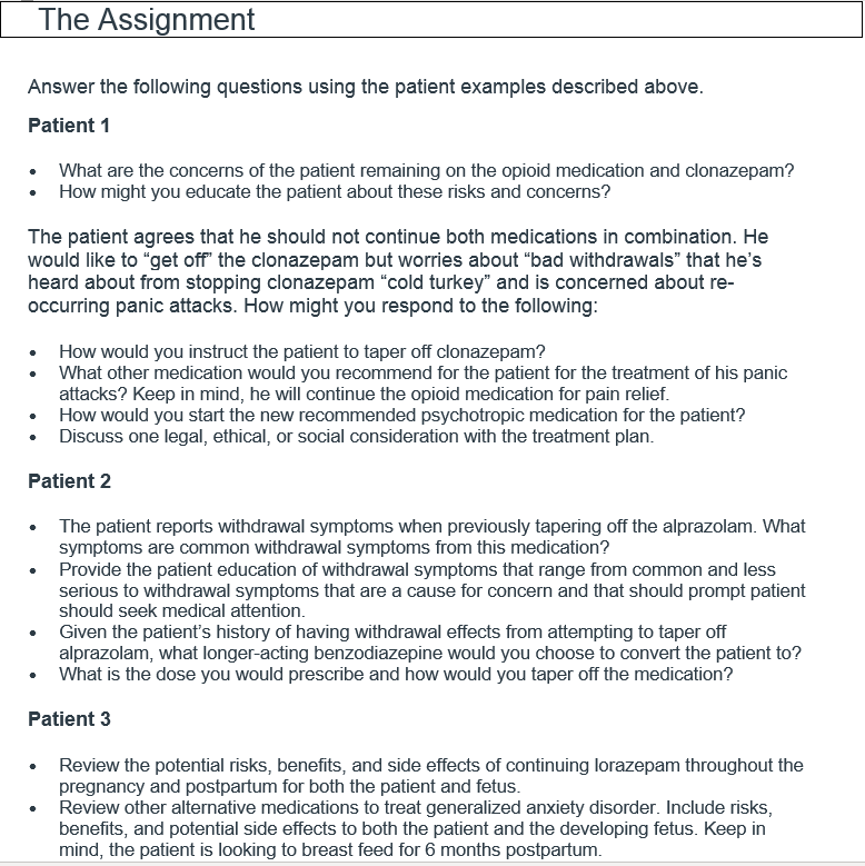 The common withdrawal symptoms from alprazolam may include insomnia, fatigue, increased anxiety, depressive symptoms, memory problems, irritability, tremors, sweating as well as insomnia. Serious withdrawal symptoms that a patient can experience include seizure, delirium, muscle cramp, rapid heart rate severe agitation, confusion as well as hallucination (Ait-Daoud et al., 2018). If you experience the serious withdrawal effects discussed above,………………………………………………purchase the entire solution at $15 only