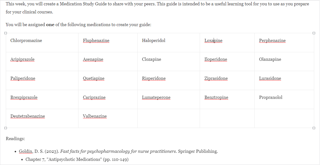 This week, you will create a Medication Study Guide to share with your peers. This guide is intended to be a useful learning tool for you to use as you prepare for your clinical courses.