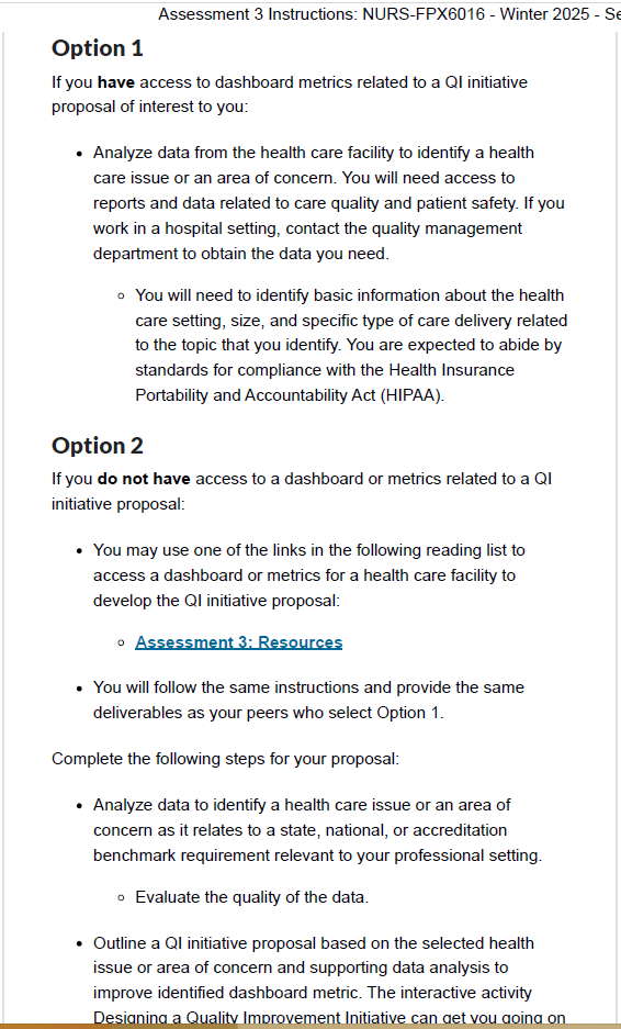 In this assessment, you will make a QI initiative proposal based on a health issue of professional interest to you. This proposal will be based on an analysis of dashboard metrics from a health care facility. You have two options: