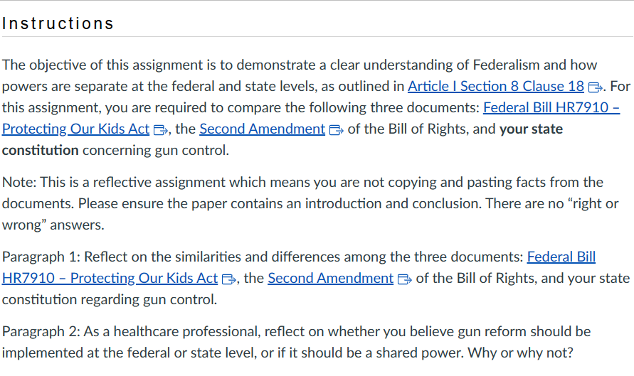 The objective of this assignment is to demonstrate a clear understanding of Federalism and how powers are separate at the federal and state levels, as outlined in Article I Section 8 Clause 18.. For this assignment, you are required to compare the following three documents: Federal Bill HR7910 – Protecting Our Kids Act., the Second Amendment. of the Bill of Rights, and your state constitution concerning gun control.