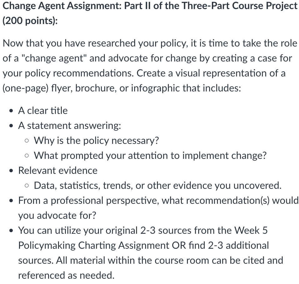 Now that you have researched your policy, it is time to take the role of a “change agent” and advocate for change by creating a case for your policy recommendations. Create a visual representation of a (one-page) flyer, brochure, or infographic that includes: