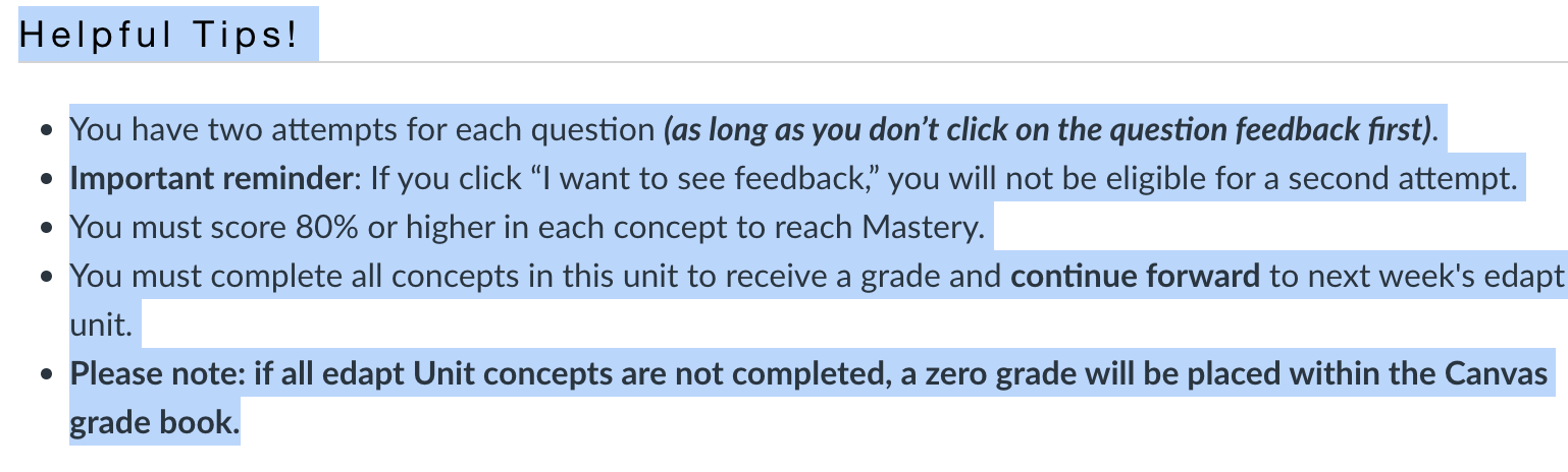 - You must complete all concepts in this unit to receive a grade and continue forward to next week’s edapt unit.