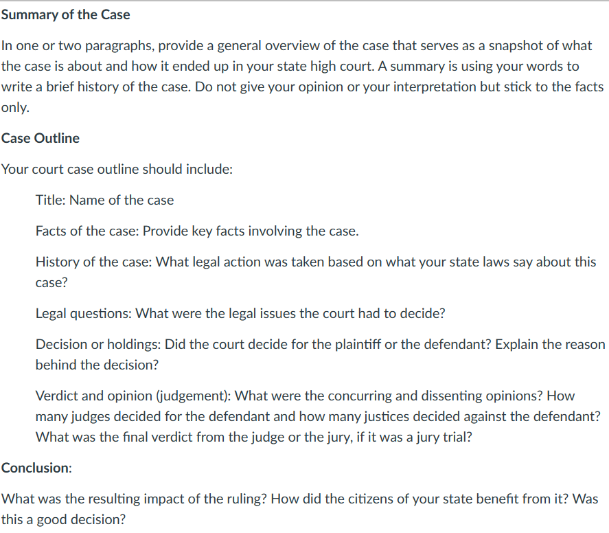 In one or two paragraphs, provide a general overview of the case that serves as a snapshot of what the case is about and how it ended up in your state high court. A summary is using your words to write a brief history of the case. Do not give your opinion or your interpretation but stick to the facts only.