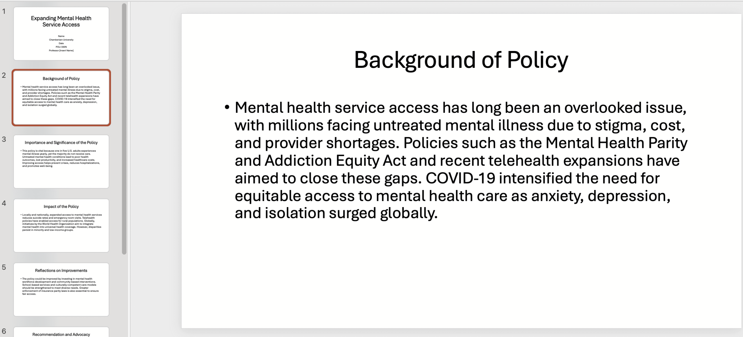 - Slide 1: The title slide should include the name of the policy, your name, university name, date, course name, and professor name.