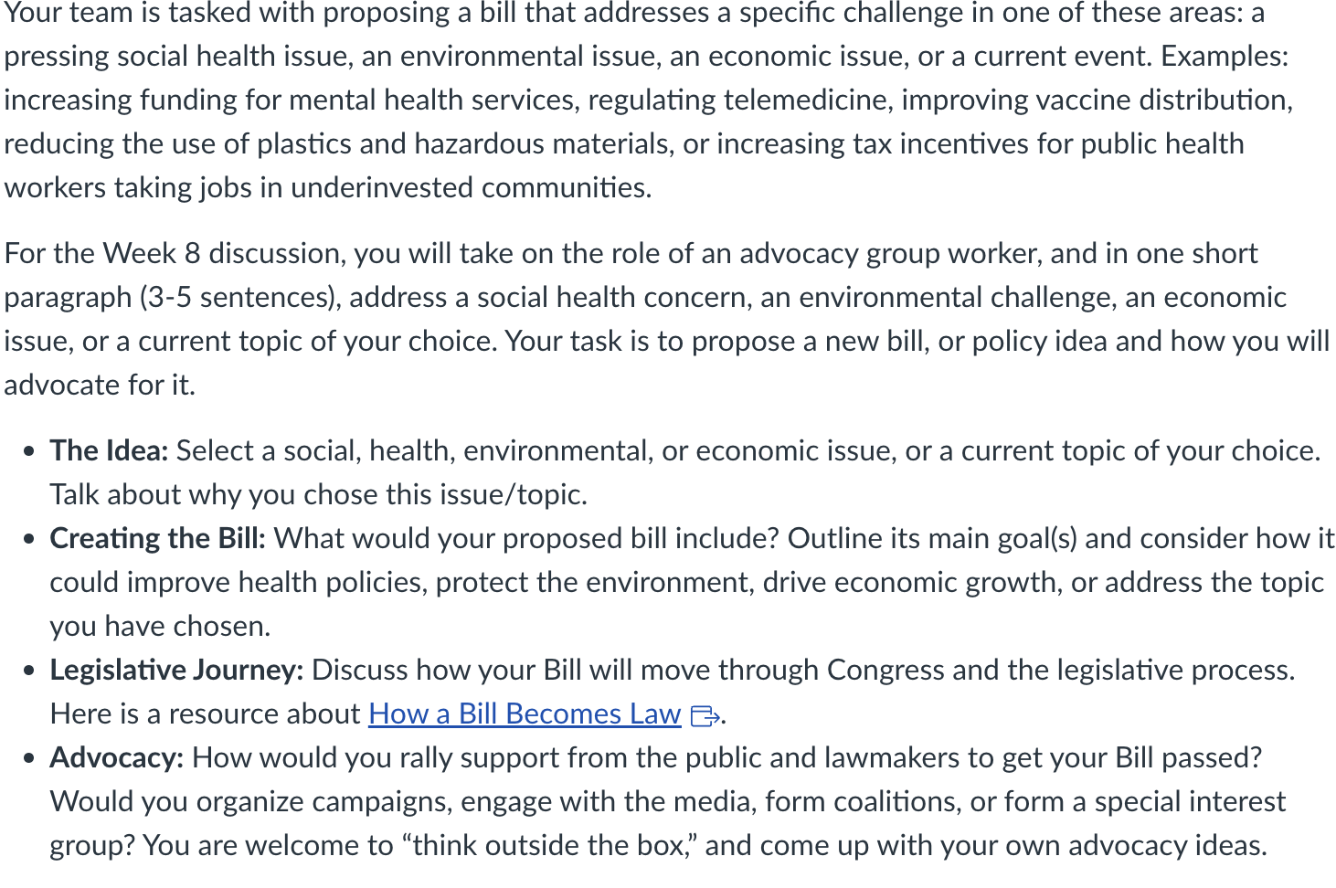 For the Week 8 discussion, you will take on the role of an advocacy group worker, and in one short paragraph (3-5 sentences), address a social health concern, an environmental challenge, an economic issue, or a current topic of your choice. Your task is to propose a new bill, or policy idea and how you will advocate for it.
